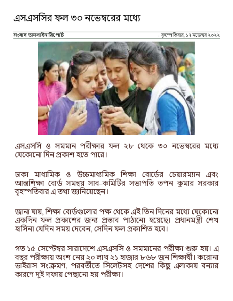 এসএসসির ফল ৩০ নভেম্বরের মধ্যে _ সংবাদ অনলাইন Published on 17 November 2022 Newspaper দৈনিক সংবাদ Category Public Examination Public Examination SSC Download