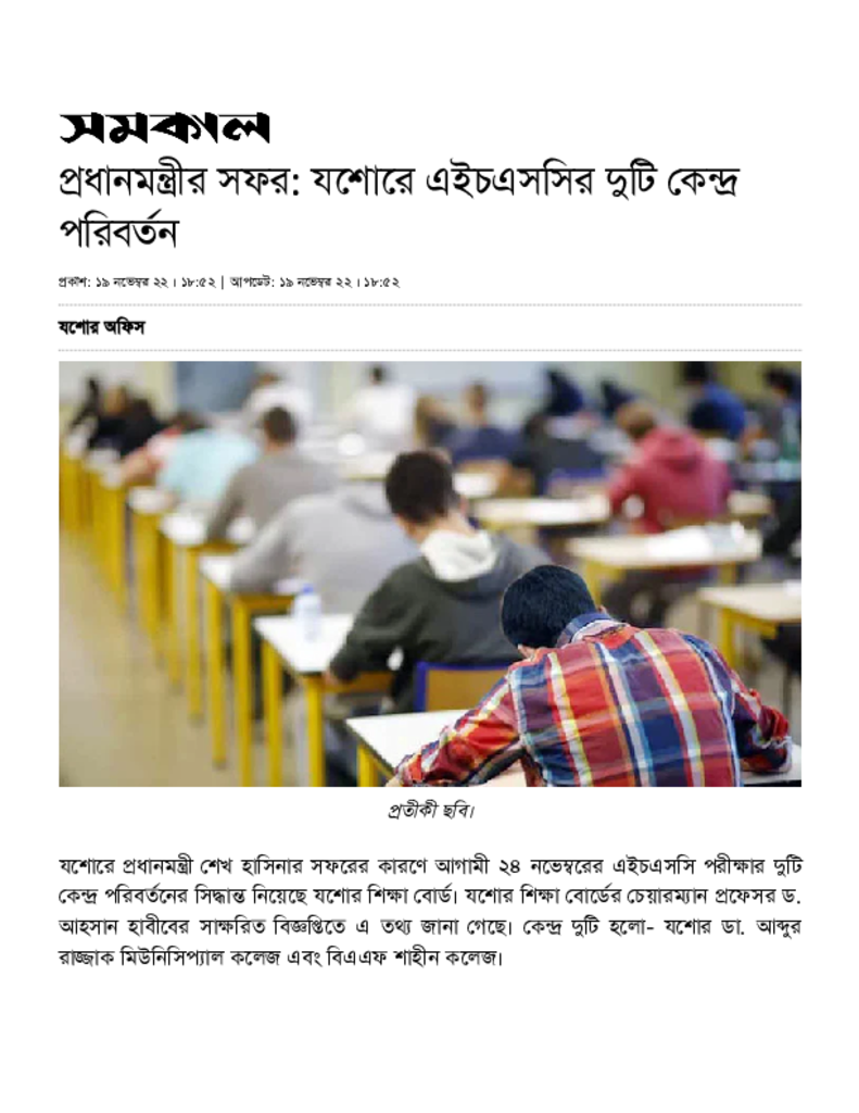 প্রধানমন্ত্রীর সফর_ যশোরে এইচএসসির দুটি কেন্দ্র পরিবর্তন Published on 19 November 2022 Newspaper দৈনিক সমকাল Category Public Examination Public Examination HSC Download