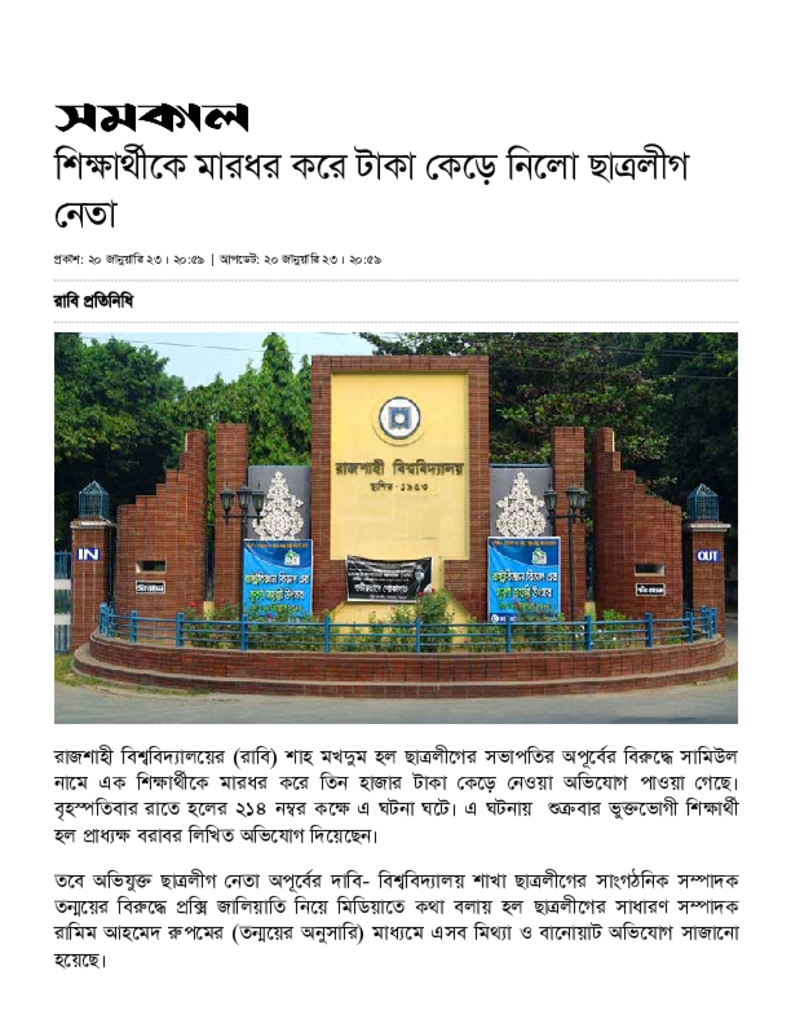 শিক্ষার্থীকে মারধর করে টাকা কেড়ে নিলো ছাত্রলীগ নেতা.pdf Published on 20 January 2023 Newspaper দৈনিক সমকাল Category Campus Terrorism Download