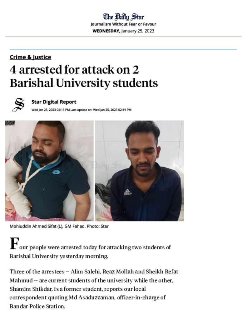 4 arrested for attack on 2 Barishal University students _ The Daily Star.pdf Published on 25 January 2023 Newspaper The Daily Star Category Campus Terrorism Download