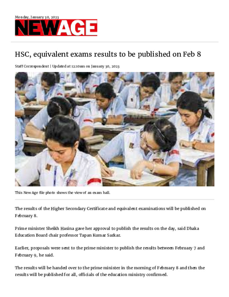 HSC, equivalent exams results to be published on Feb 8 _ New Age.pdf Published on 30 January 2023 Newspaper New Age Category Public Examination Public Examination HSC Download