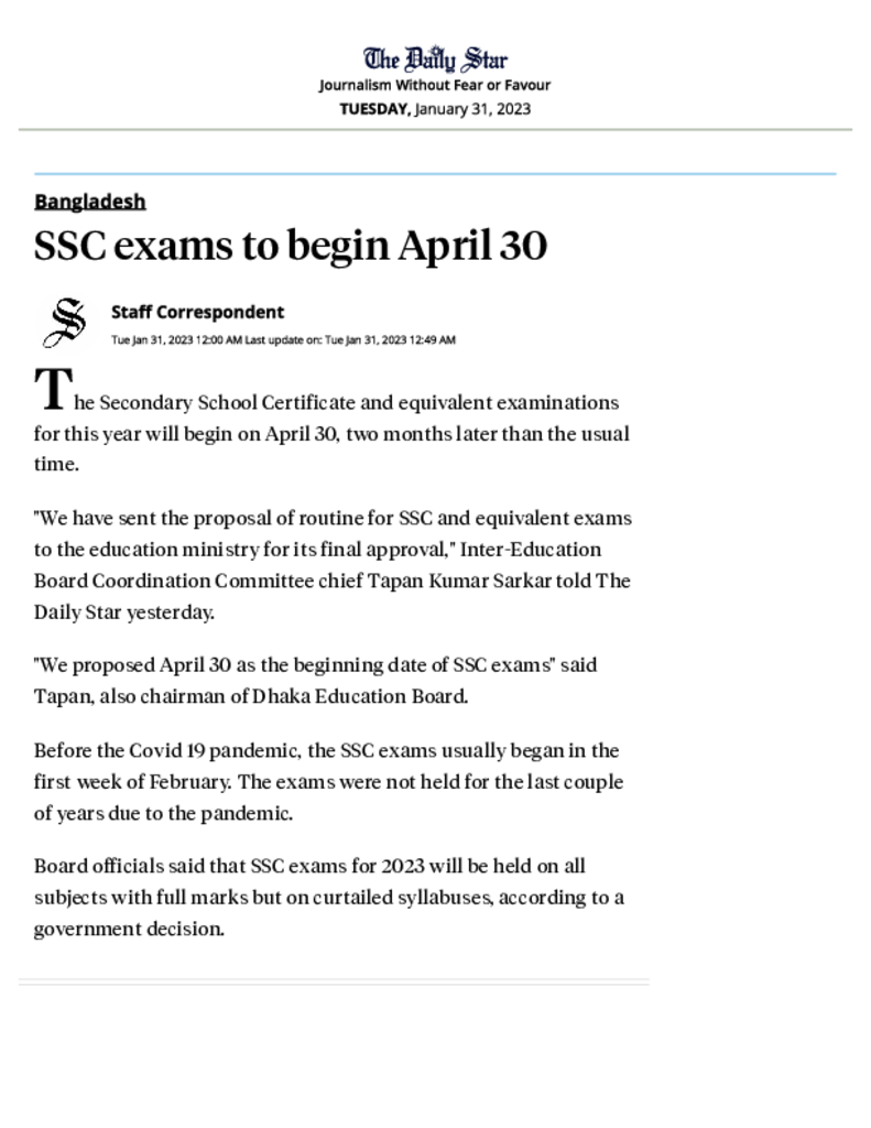 SSC exams to begin April 30 _ The Daily Star.pdf Published on 31 January 2023 Newspaper The Daily Star Category Public Examination Public Examination SSC Download