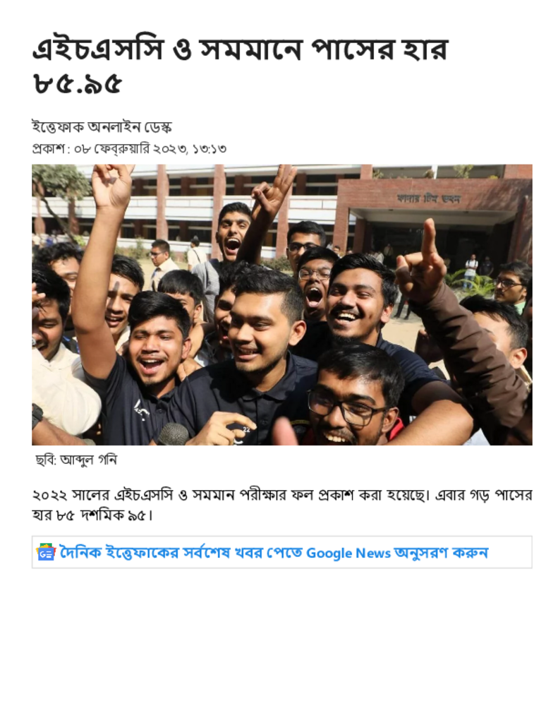 এইচএসসি ও সমমানে পাসের হার ৮৫.৯৫.pdf Published on 08 February 2023 Newspaper দৈনিক ইত্তেফাক Category Public Examination Public Examination HSC Download