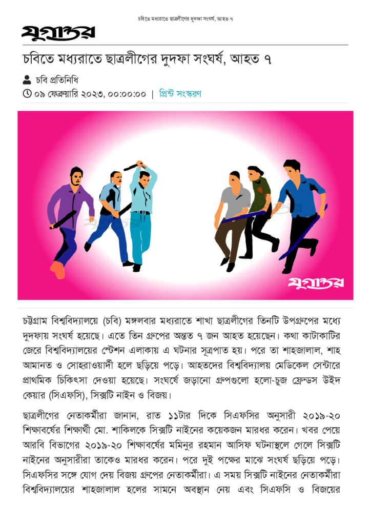 চবিতে মধ্যরাতে ছাত্রলীগের দুদফা সংঘর্ষ, আহত ৭.pdf Published on 09 February 2023 Newspaper দৈনিক যুগান্তর Category Campus Terrorism General Education Download
