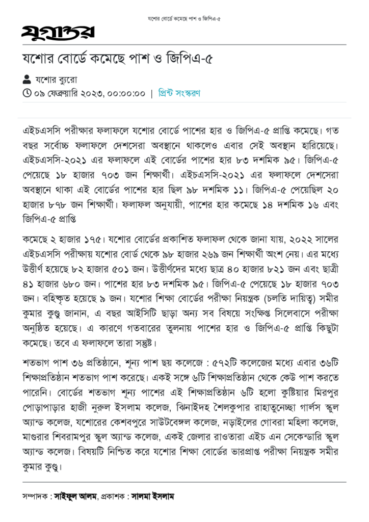 যশোর বোর্ডে কমেছে পাশ ও জিপিএ-৫.pdf Published on 09 February 2023 Newspaper দৈনিক যুগান্তর Category Public Examination Public Examination HSC Download