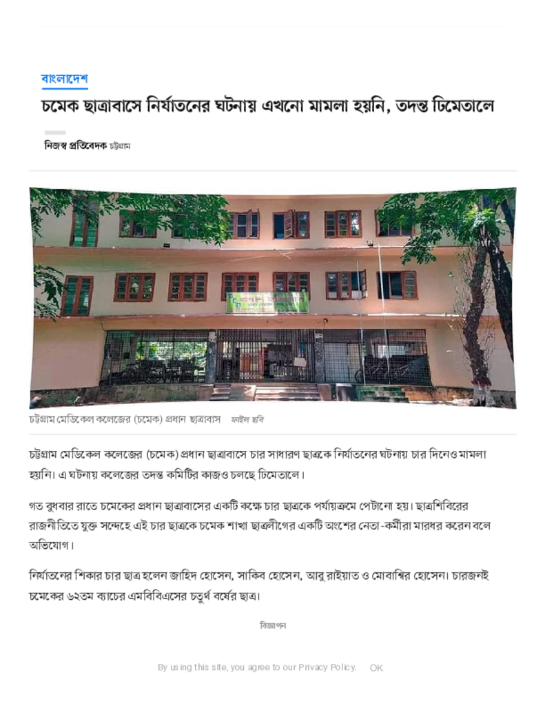 চমেক ছাত্রাবাসে নির্যাতনের ঘটনায় এখনো মামলা হয়নি, তদন্ত ঢিমেতালে.pdf Published on 12 February 2023 Newspaper দৈনিক প্রথম আলো Category Campus Terrorism General Education Professional Education Medical Download