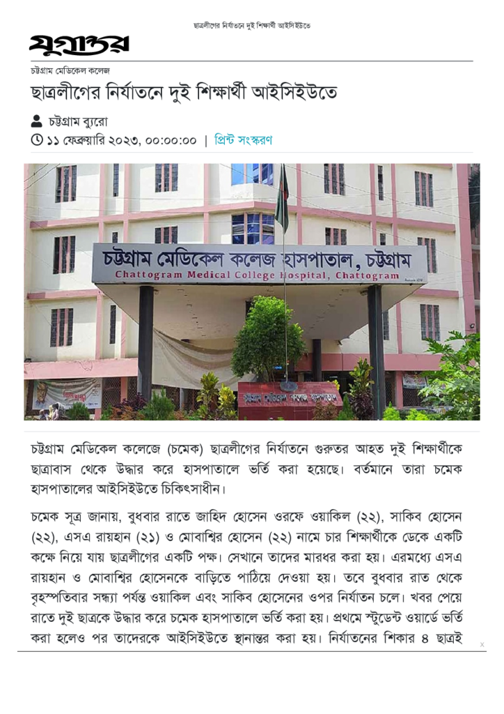 ছাত্রলীগের নির্যাতনে দুই শিক্ষার্থী আইসিইউতে.pdf Published on 11 February 2023 Newspaper দৈনিক যুগান্তর Category Campus Terrorism General Education Professional Education Medical Download