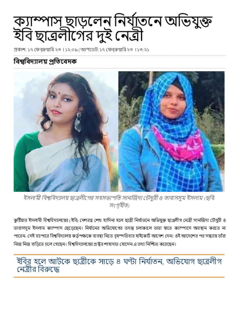 ক্যাম্পাস ছাড়লেন নির্যাতনে অভিযুক্ত ইবি ছাত্রলীগের দুই নেত্রী.pdf Published on 17 February 2023 Newspaper দৈনিক সমকাল Category Campus Terrorism General Education Download