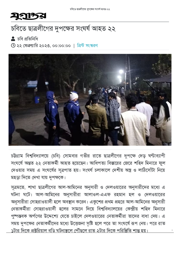 চবিতে ছাত্রলীগের দুপক্ষের সংঘর্ষ আহত ২২.pdf Published on 22 February 2023 Newspaper দৈনিক যুগান্তর Category Campus Terrorism General Education Download