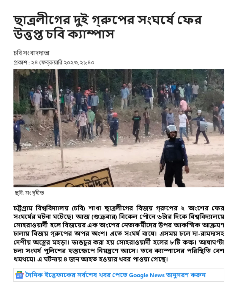 ছাত্রলীগের দুই গ্রুপের সংঘর্ষে ফের উত্তপ্ত চবি ক্যাম্পাস.pdf Published on 24 February 2023 Newspaper দৈনিক ইত্তেফাক Category Campus Terrorism General Education Download