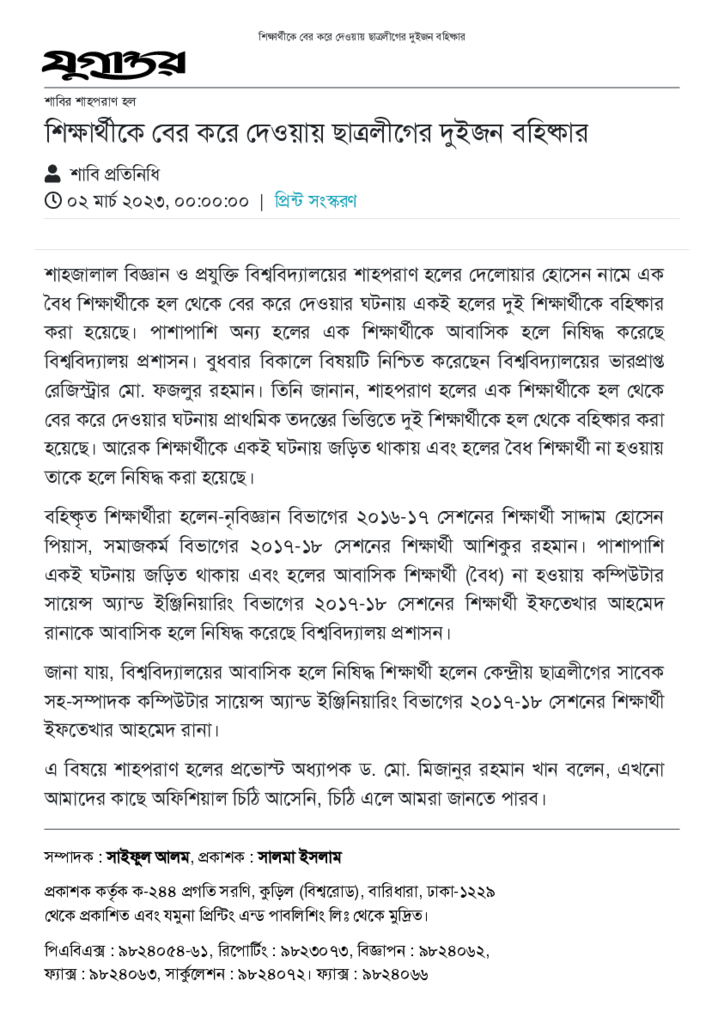 শিক্ষার্থীকে বের করে দেওয়ায় ছাত্রলীগের দুইজন বহিষ্কার.pdf Published on 02 March 2023 Newspaper দৈনিক যুগান্তর Category Campus Terrorism General Education Download