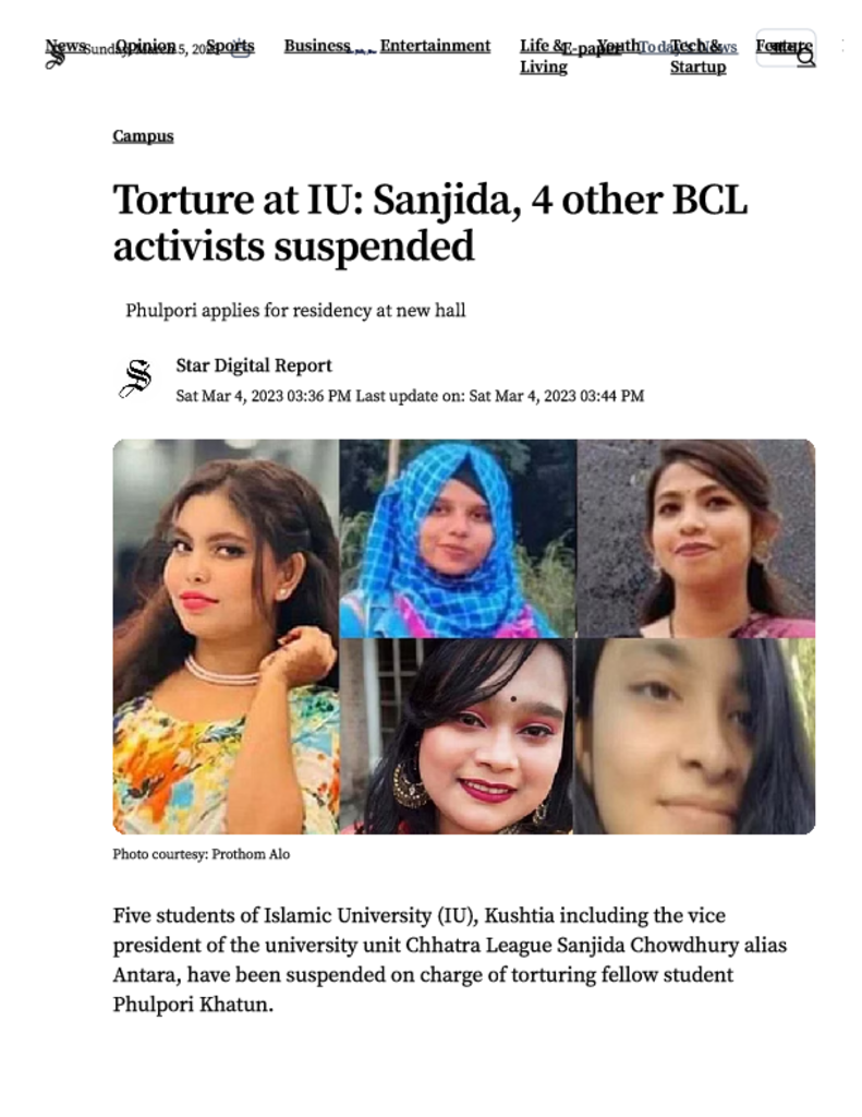 Torture at IU_ Sanjida, 4 other BCL activists suspended _ The Daily Star.pdf Published on 04 March 2023 Newspaper The Daily Star Category Campus Terrorism General Education Download