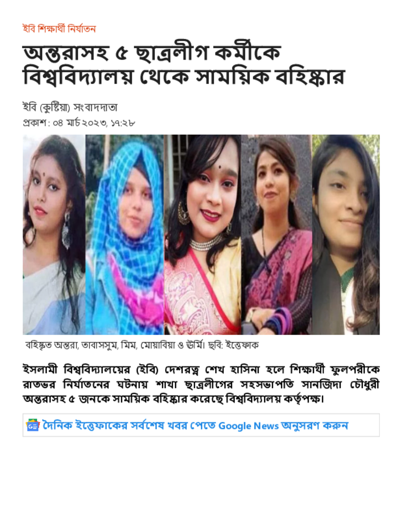 অন্তরাসহ ৫ ছাত্রলীগ কর্মীকে বিশ্ববিদ্যালয় থেকে সাময়িক বহিষ্কার.pdf Published on 04 March 2023 Newspaper দৈনিক ইত্তেফাক Category Campus Terrorism General Education Download
