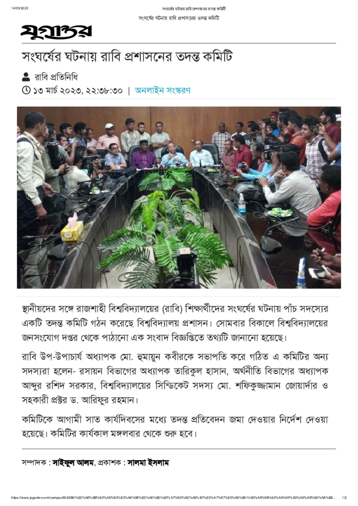 সংঘর্ষের ঘটনায় রাবি প্রশাসনের তদন্ত কমিটি Published on 13 March 2023 Newspaper দৈনিক যুগান্তর Category Campus Terrorism Download