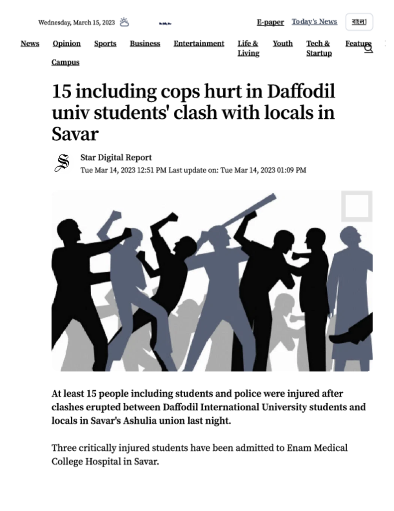 15 including cops hurt in Daffodil univ students' clash with locals in Savar _ undefined Published on 14 March 2023 Newspaper The Daily Star Category Campus Terrorism Download