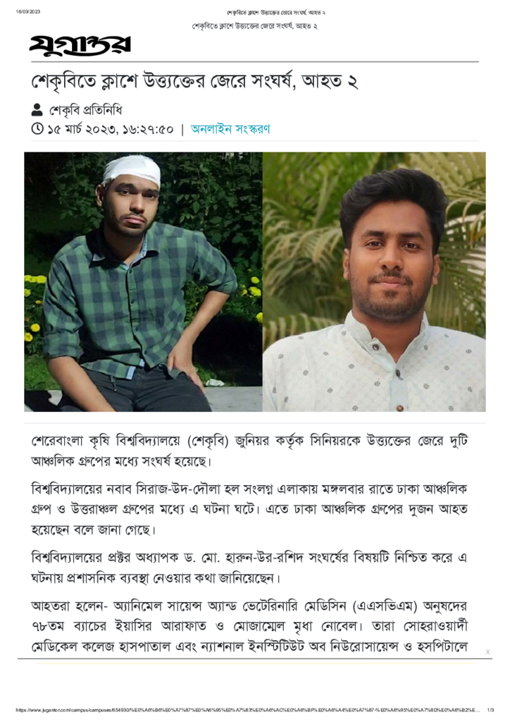 শেকৃবিতে ক্লাশে উত্ত্যক্তের জেরে সংঘর্ষ, আহত ২ Published on 15 March 2023 Newspaper দৈনিক যুগান্তর Category Campus Terrorism Download