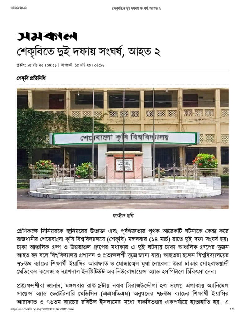 শেকৃবিতে দুই দফায় সংঘর্ষ, আহত ২ Published on 15 March 2023 Newspaper দৈনিক সমকাল Category Campus Terrorism Download