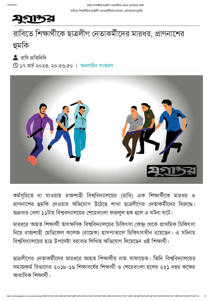রাবিতে শিক্ষার্থীকে ছাত্রলীগ নেতাকর্মীদের মারধর, প্রাণনাশের হুমকি Published on 17 March 2023 Newspaper দৈনিক যুগান্তর Category Campus Terrorism Download