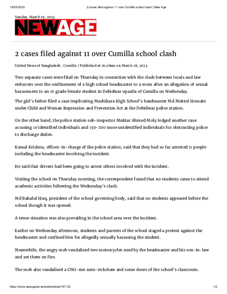 2 cases filed against 11 over Cumilla school clash _ New Age