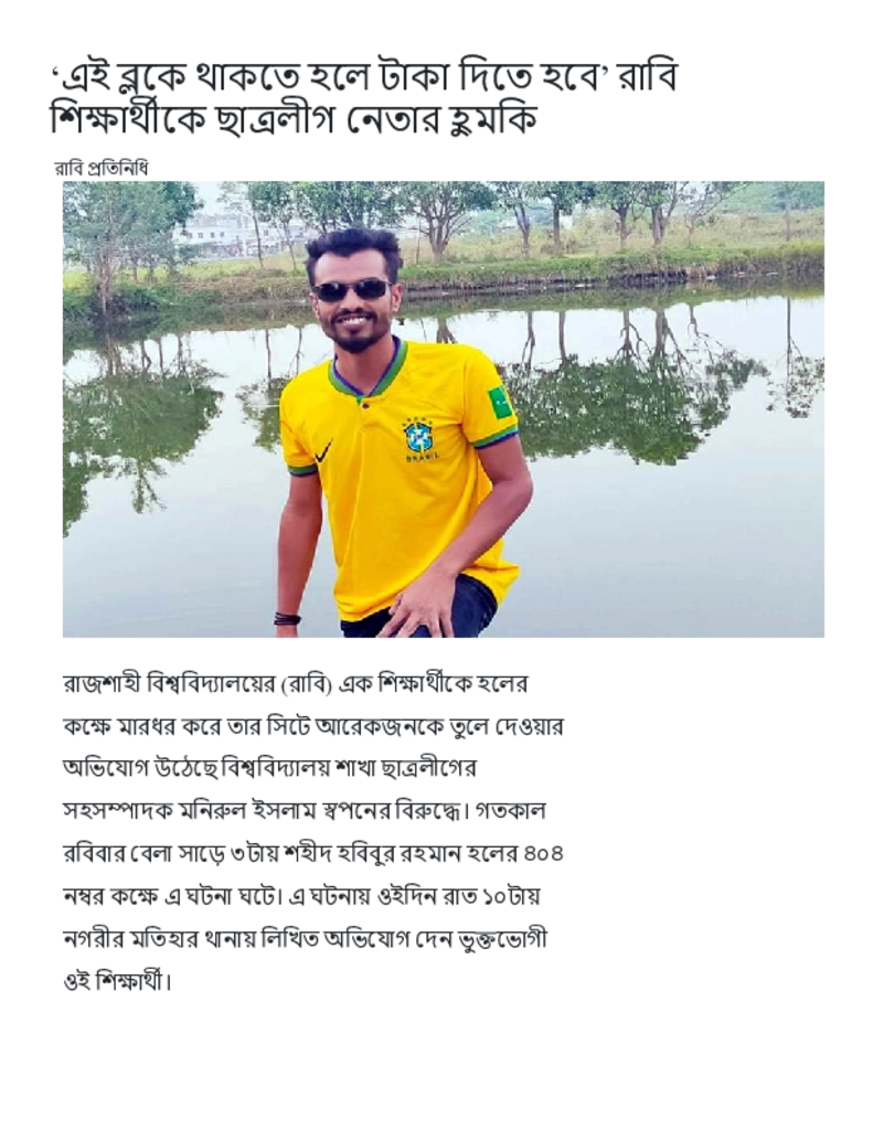 ‘এই ব্লকে থাকতে হলে টাকা দিতে হবে’ রাবি শিক্ষার্থীকে ছাত্রলীগ নেতার হুমকি.pdf Published on 27 March 2023 Newspaper দৈনিক কালের কন্ঠ Category Campus Terrorism General Education Download