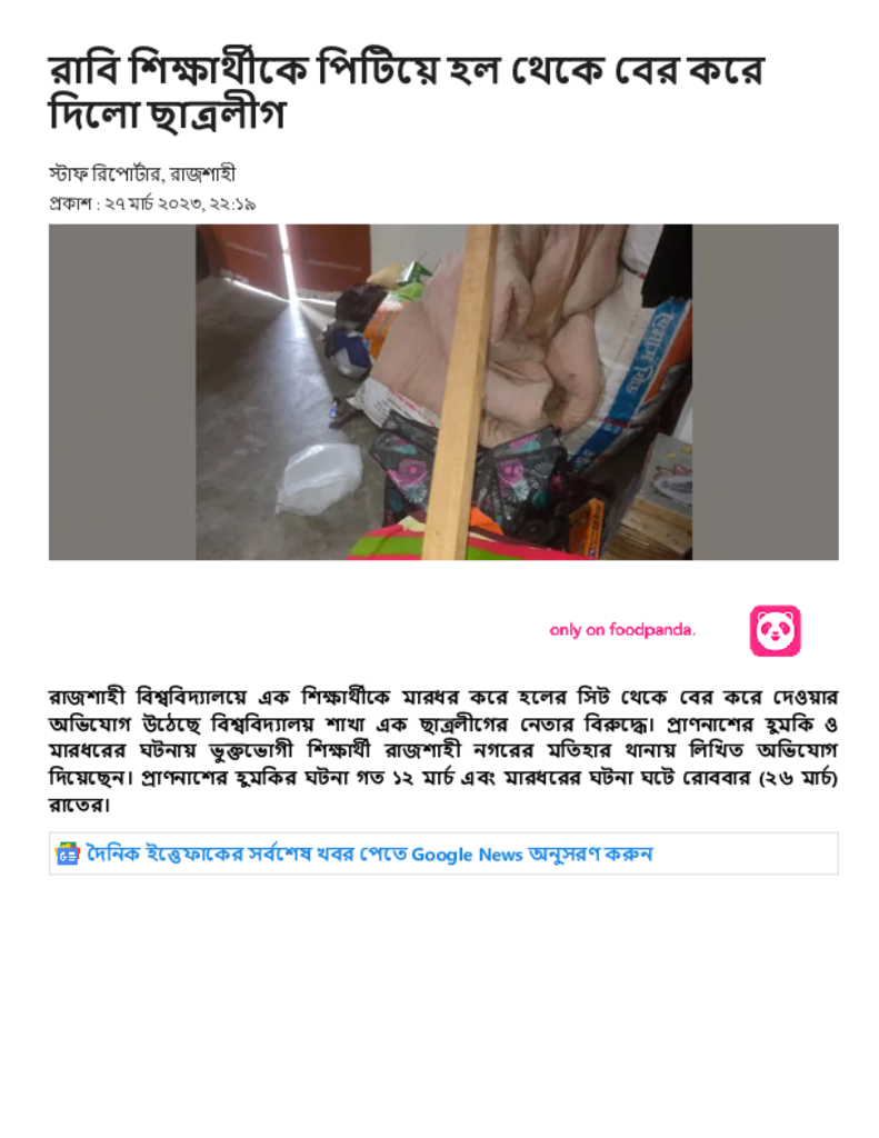 রাবি শিক্ষার্থীকে পিটিয়ে হল থেকে বের করে দিলো ছাত্রলীগ.pdf Published on 27 March 2023 Newspaper দৈনিক ইত্তেফাক Category Campus Terrorism General Education Download