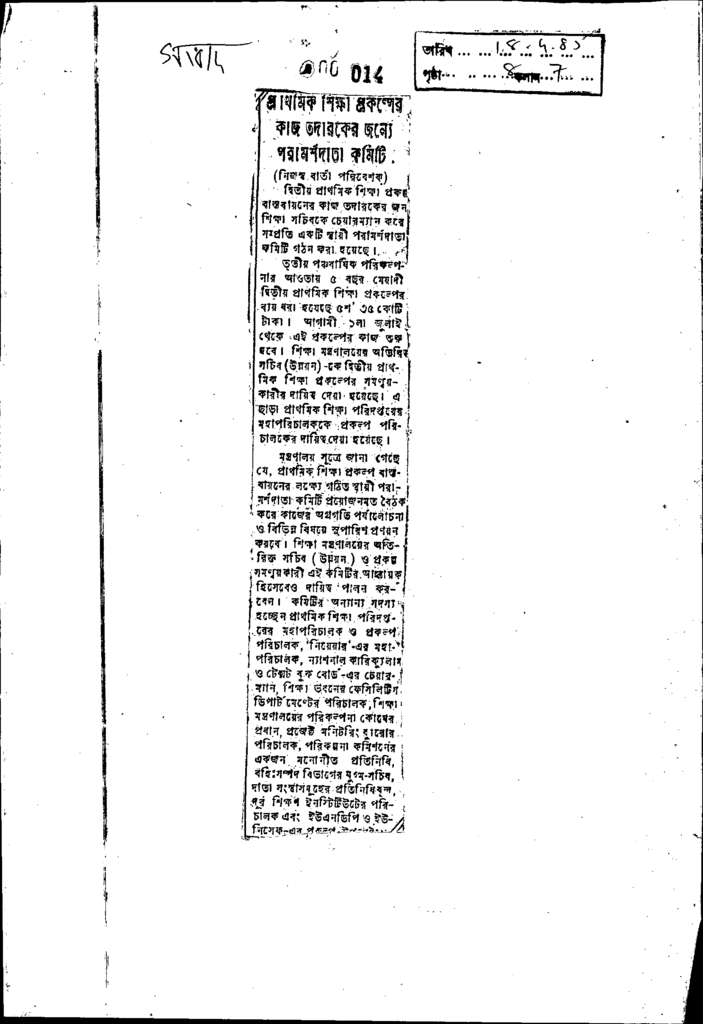 প্রাথমিক শিক্ষা প্রকল্পের কাজ তদারকে জন্য পরামর্দাতা কমিটি Published on Newspaper দৈনিক সংবাদ Category General Education Download