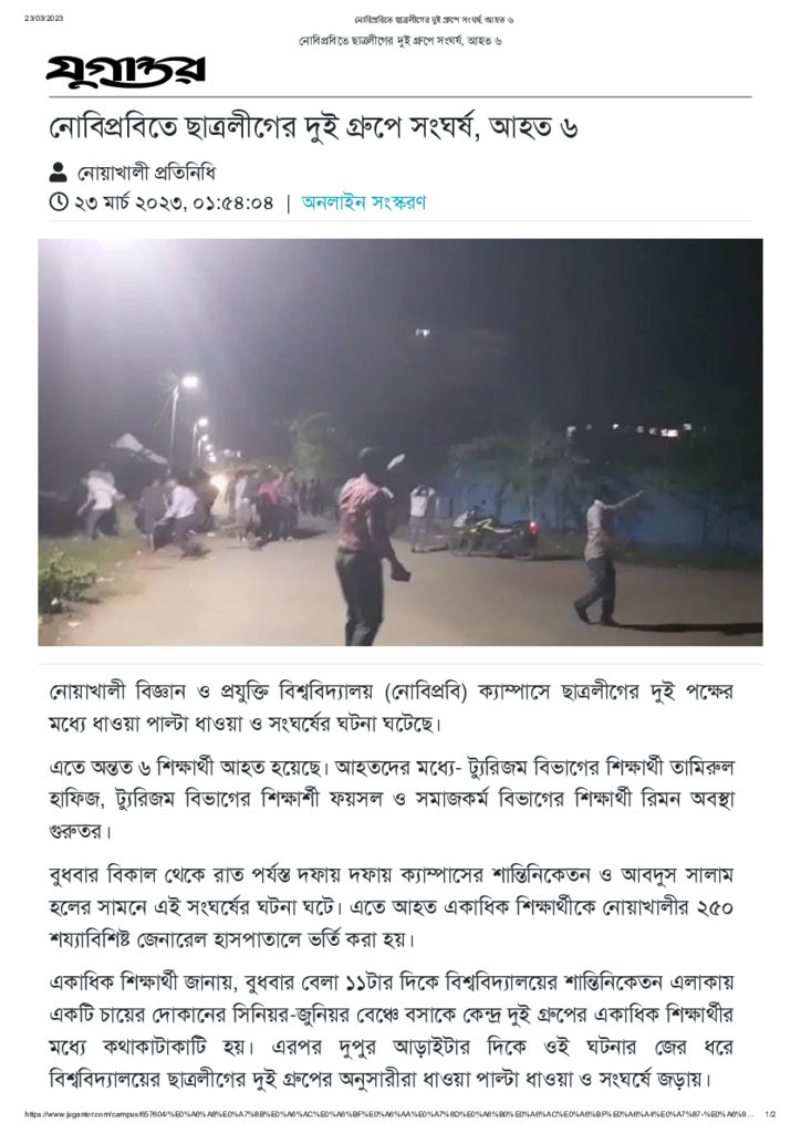 নোবিপ্রবিতে ছাত্রলীগের দুই গ্রুপে সংঘর্ষ, আহত ৬ Published on 23 March 2023 Newspaper দৈনিক যুগান্তর Category Campus Terrorism Download