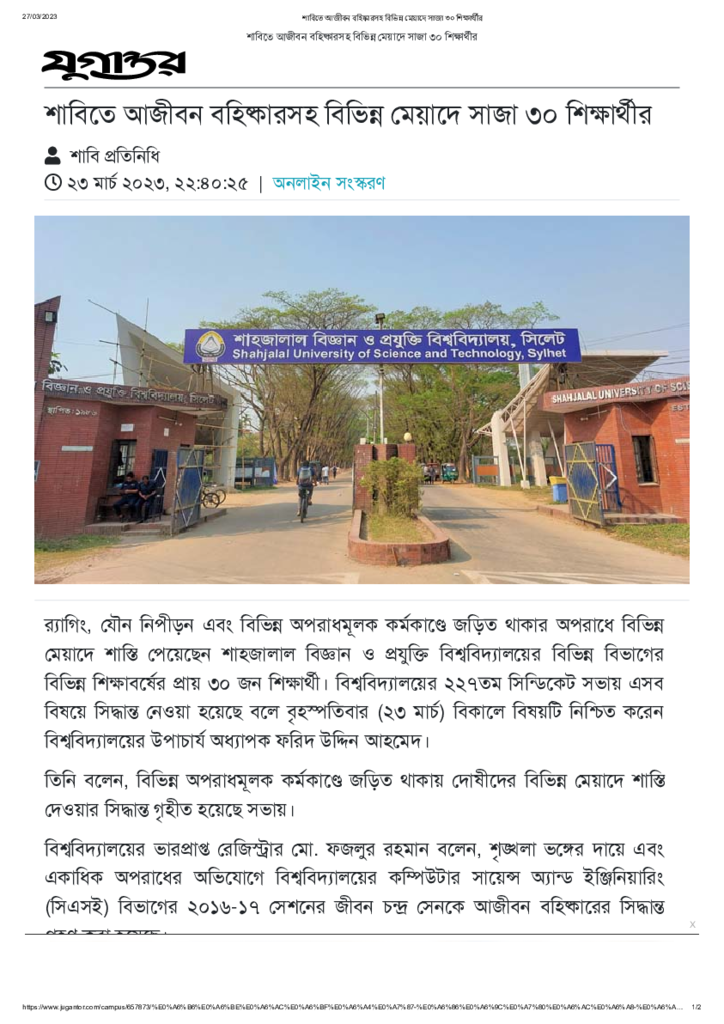 শাবিতে আজীবন বহিষ্কারসহ বিভিন্ন মেয়াদে সাজা ৩০ শিক্ষার্থীর Published on 23 March 2023 Newspaper দৈনিক যুগান্তর Category Campus Terrorism Download