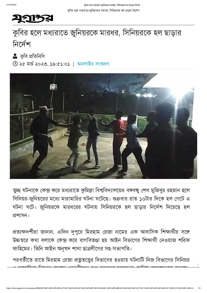কুবির হলে মধ্যরাতে জুনিয়রকে মারধর, সিনিয়রকে হল ছাড়ার নির্দেশ Published on 25 March 2023 Newspaper দৈনিক যুগান্তর Category Campus Terrorism Download