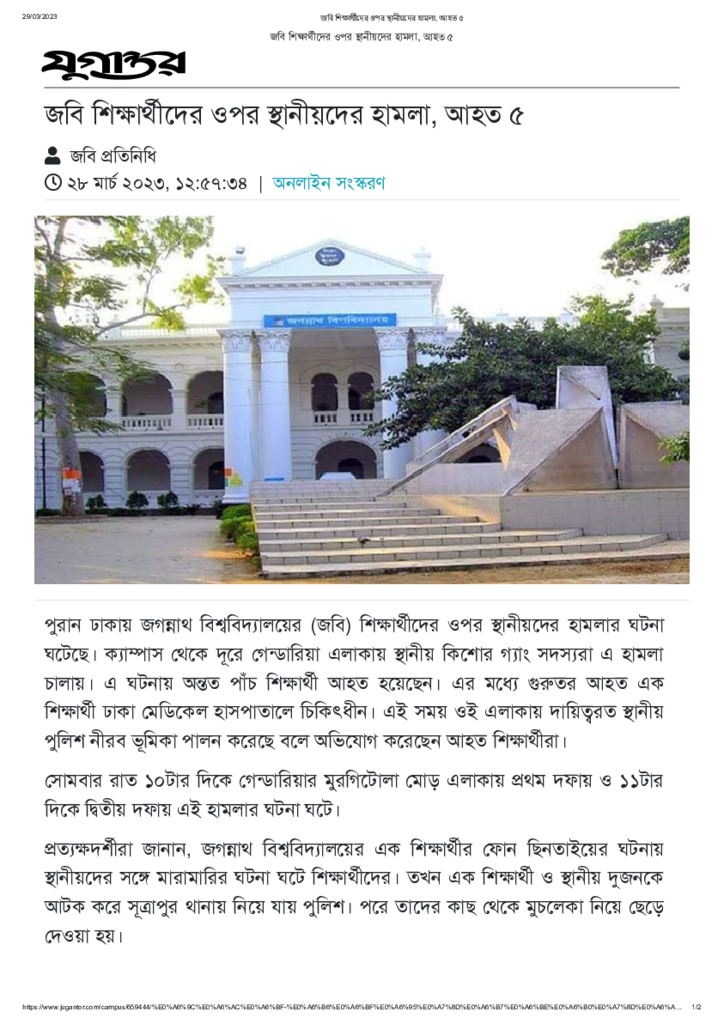 জবি শিক্ষার্থীদের ওপর স্থানীয়দের হামলা, আহত ৫ Published on 28 March 2023 Newspaper দৈনিক যুগান্তর Category Campus Terrorism Download