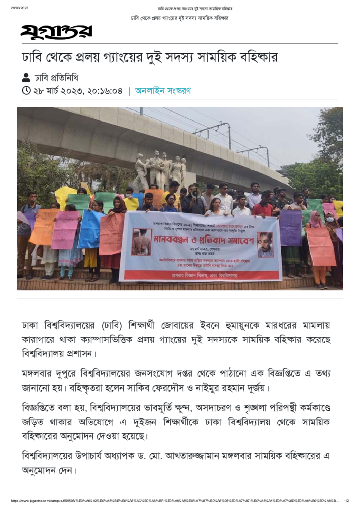 ঢাবি থেকে প্রলয় গ্যাংয়ের দুই সদস্য সাময়িক বহিষ্কার Published on 28 March 2023 Newspaper দৈনিক যুগান্তর Category Campus Terrorism Download