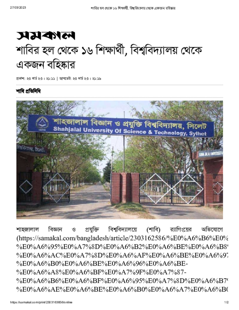 শাবির হল থেকে ১৬ শিক্ষার্থী, বিশ্ববিদ্যালয় থেকে একজন বহিষ্কার Published on 23 March 2023 Newspaper দৈনিক সমকাল Category Campus Terrorism Download