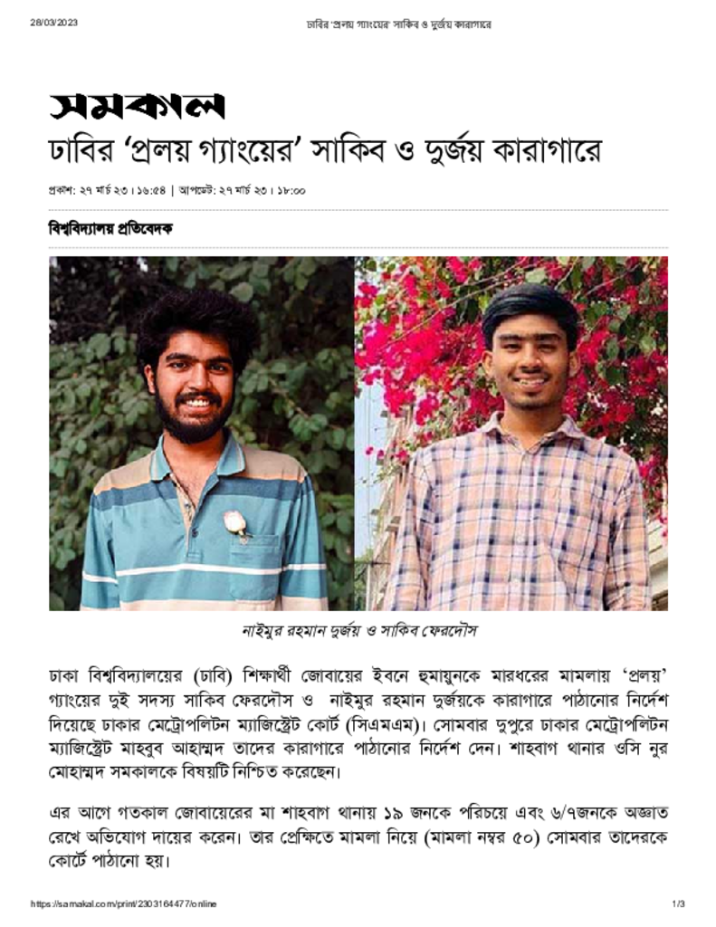 ঢাবির ‘প্রলয় গ্যাংয়ের’ সাকিব ও দুর্জয় কারাগারে Published on 27 March 2023 Newspaper দৈনিক সমকাল Category Campus Terrorism Download