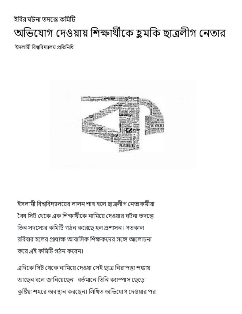 অভিযোগ দেওয়ায় শিক্ষার্থীকে হুমকি ছাত্রলীগ নেতার.pdf Published on 03 April 2023 Newspaper দৈনিক কালের কন্ঠ Category Campus Terrorism General Education Download