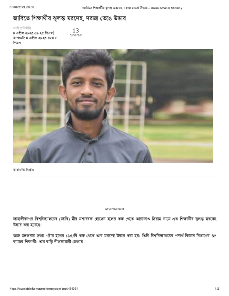 জাবিতে শিক্ষার্থীর ঝুলন্ত মরদেহ, দরজা ভেঙে উদ্ধার – Dainik Amader Shomoy Published on 04 April 2023 Newspaper দৈনিক আমাদের সময় Category Campus Terrorism Download