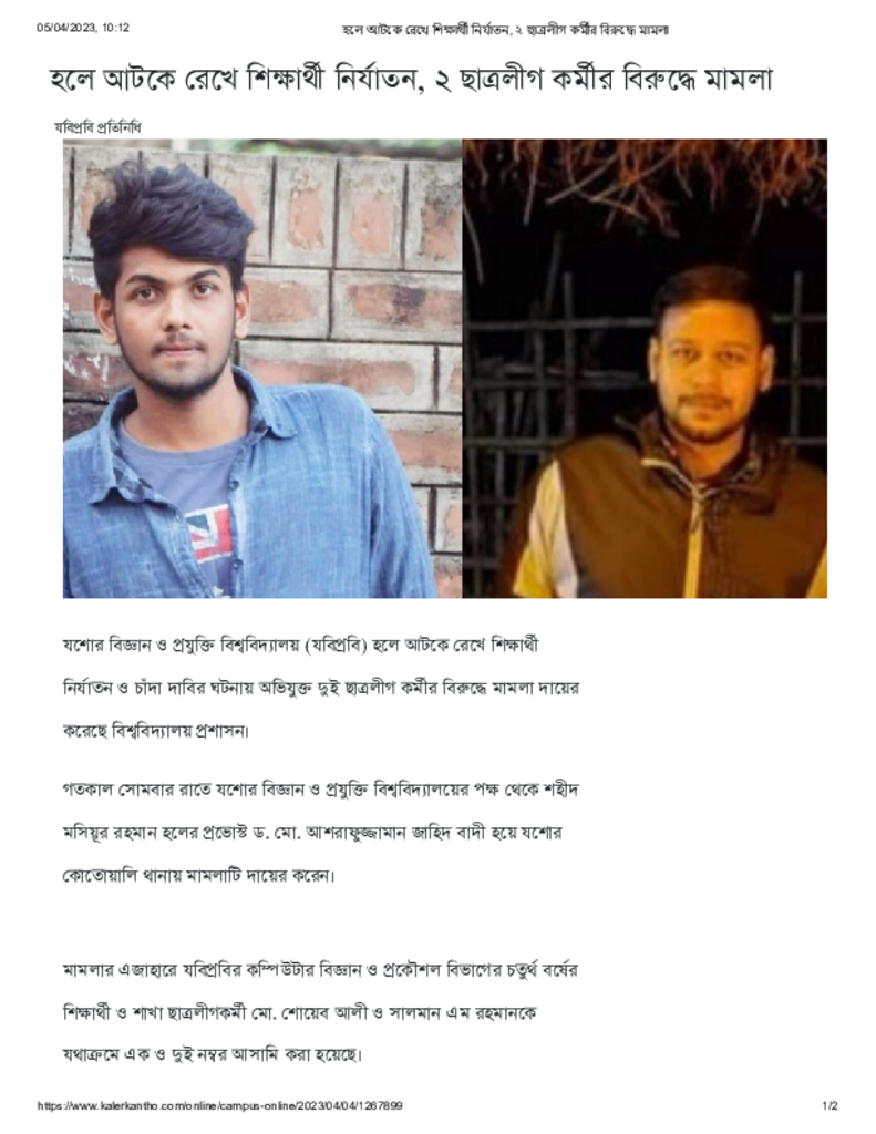 হলে আটকে রেখে শিক্ষার্থী নির্যাতন, ২ ছাত্রলীগ কর্মীর বিরুদ্ধে মামলা Published on 04 April 2023 Newspaper দৈনিক কালের কন্ঠ Category Campus Terrorism Download