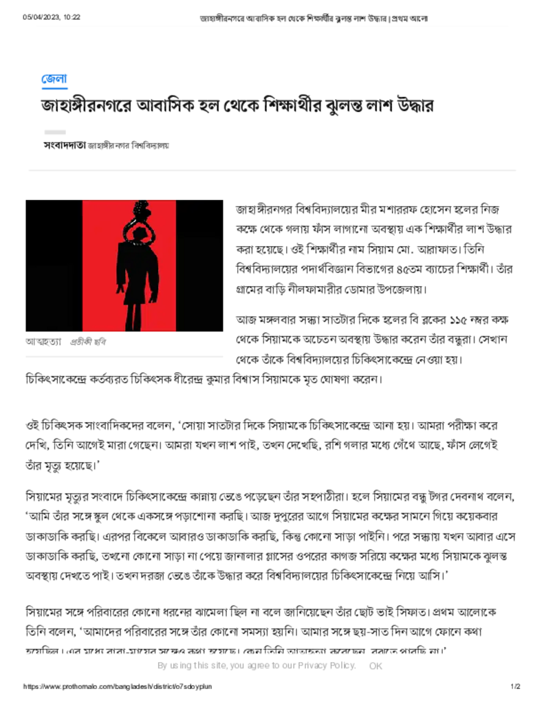 জাহাঙ্গীরনগরে আবাসিক হল থেকে শিক্ষার্থীর ঝুলন্ত লাশ উদ্ধার _ প্রথম আলো Published on 04 April 2023 Newspaper দৈনিক প্রথম আলো Category Campus Terrorism Download