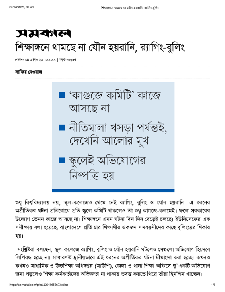 শিক্ষাঙ্গনে থামছে না যৌন হয়রানি, র_্যাগিং-বুলিং Published on 04 April 2023 Newspaper দৈনিক সমকাল Category Campus Terrorism Download