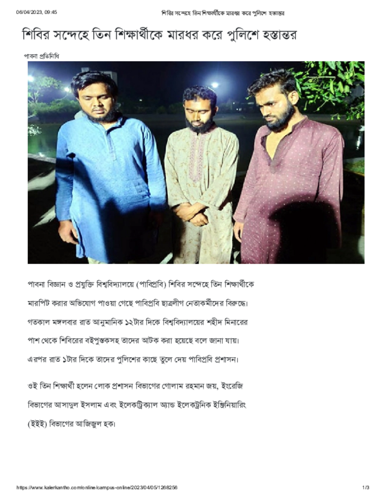 শিবির সন্দেহে তিন শিক্ষার্থীকে মারধর করে পুলিশে হস্তান্তর Published on 05 April 2023 Newspaper দৈনিক কালের কন্ঠ Category Campus Terrorism Download