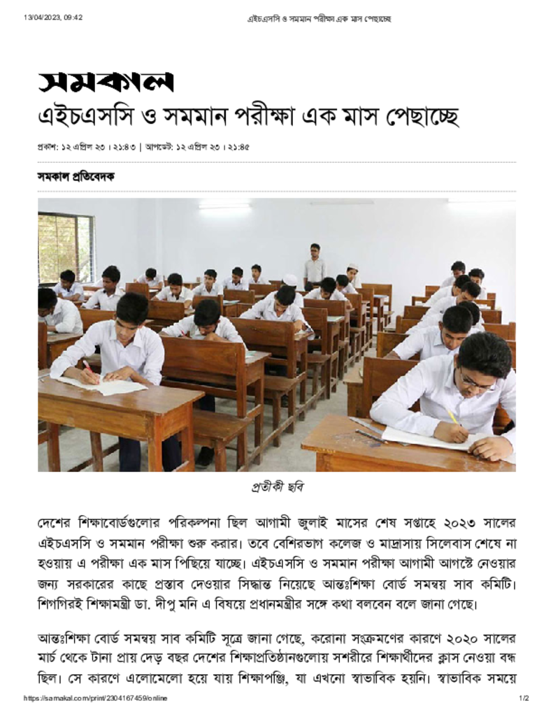 এইচএসসি ও সমমান পরীক্ষা এক মাস পেছাচ্ছে Published on 12 April 2023 Newspaper দৈনিক সমকাল Category Public Examination General Education Public Examination HSC Download
