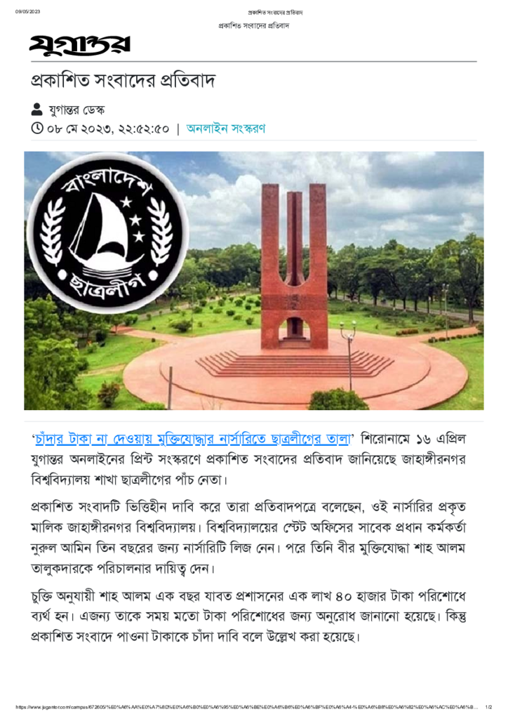 প্রকাশিত সংবাদের প্রতিবাদ Published on 08 May 2023 Newspaper দৈনিক যুগান্তর Category Campus Terrorism Download