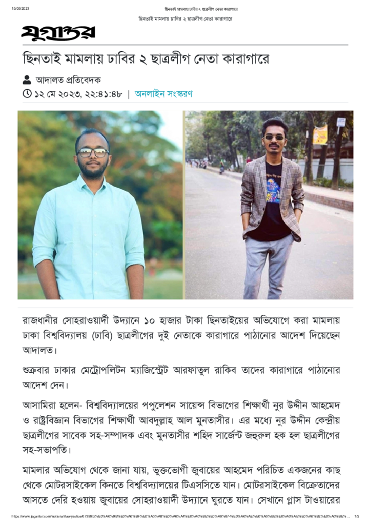 ছিনতাই মামলায় ঢাবির ২ ছাত্রলীগ নেতা কারাগারে Published on 12 May 2023 Newspaper দৈনিক যুগান্তর Category Campus Terrorism Download