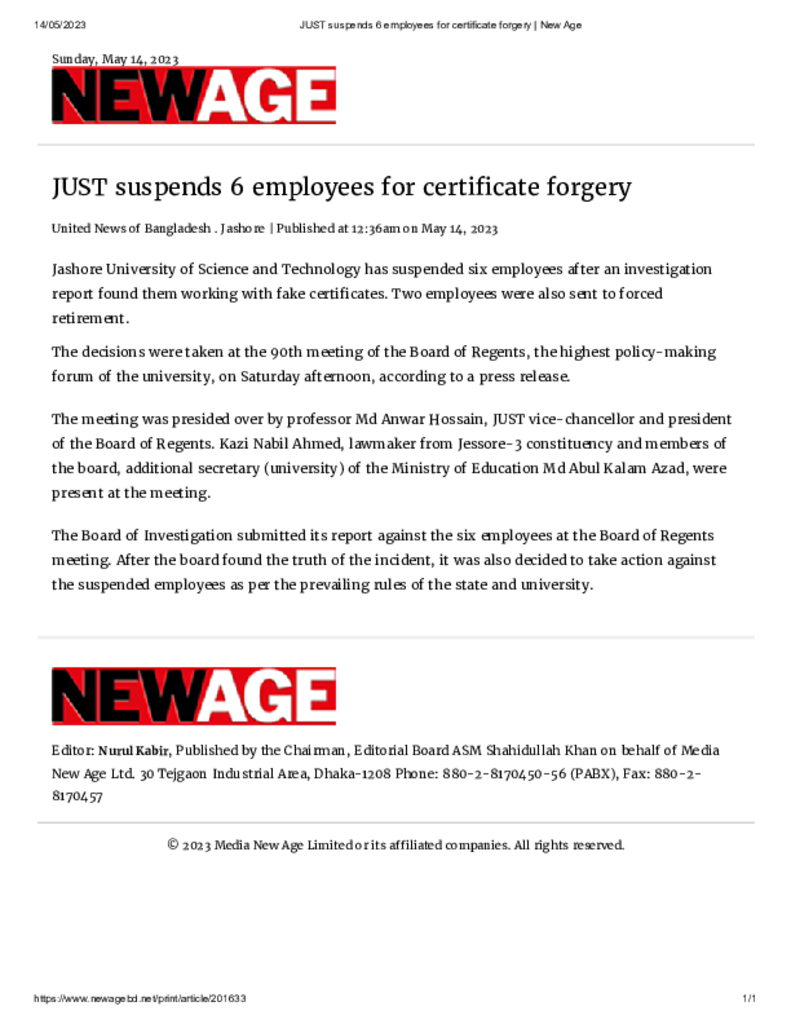 JUST suspends 6 employees for certificate forgery _ New Age Published on 14 May 2023 Newspaper New Age Category Campus Terrorism Download