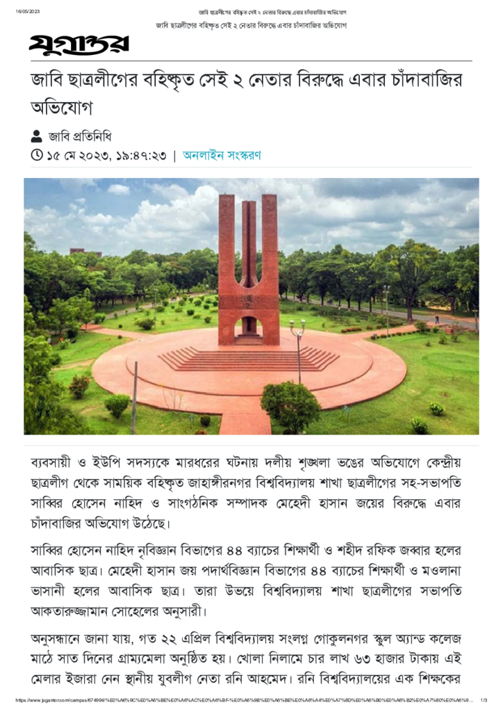 জাবি ছাত্রলীগের বহিষ্কৃত সেই ২ নেতার বিরুদ্ধে এবার চাঁদাবাজির অভিযোগ Published on 15 May 2023 Newspaper দৈনিক যুগান্তর Category Campus Terrorism Download