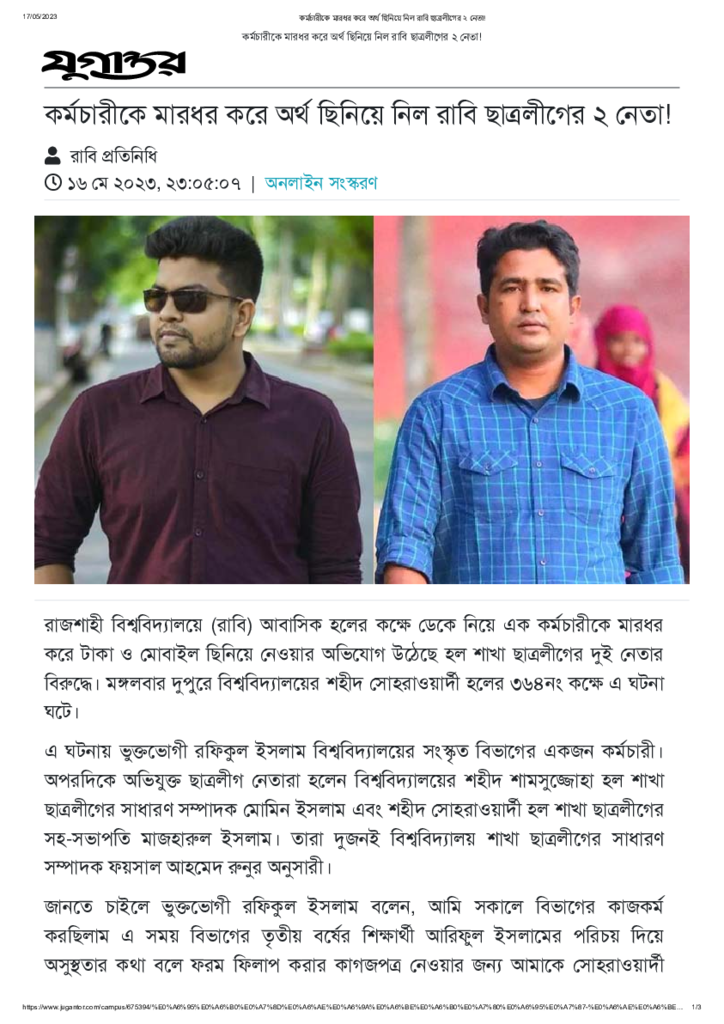 কর্মচারীকে মারধর করে অর্থ ছিনিয়ে নিল রাবি ছাত্রলীগের ২ নেতা! Published on 16 May 2023 Newspaper দৈনিক যুগান্তর Category Campus Terrorism Download