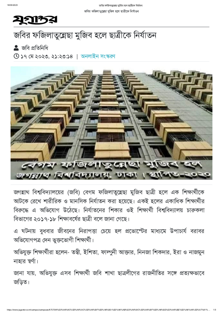 জবির ফজিলাতুন্নেছা মুজিব হলে ছাত্রীকে নির্যাতন Published on 17 May 2023 Newspaper দৈনিক যুগান্তর Category Campus Terrorism Download