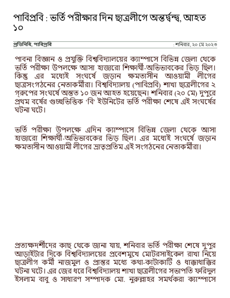 পাবিপ্রবি _ ভর্তি পরীক্ষার দিন ছাত্রলীগে অন্তর্দ্বন্দ্ব, আহত ১০ _ সংবাদ অনলাইন.pdf Published on 20 May 2023 Newspaper দৈনিক সংবাদ Category Campus Terrorism Download