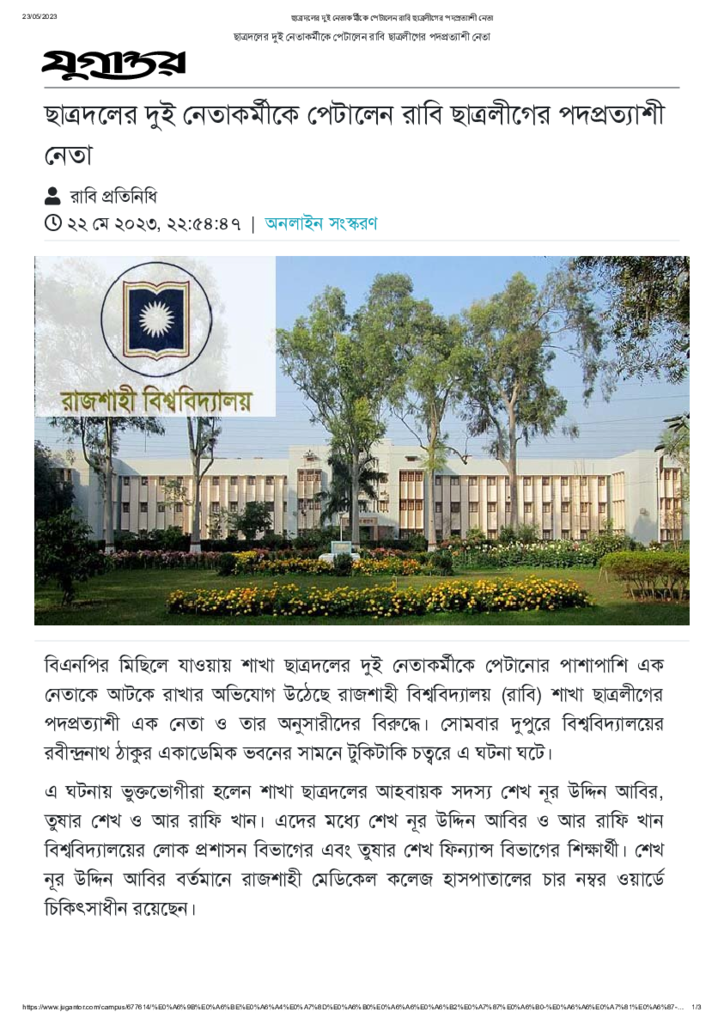 ছাত্রদলের দুই নেতাকর্মীকে পেটালেন রাবি ছাত্রলীগের পদপ্রত্যাশী নেতা Published on 22 May 2023 Newspaper দৈনিক যুগান্তর Category Campus Terrorism Download