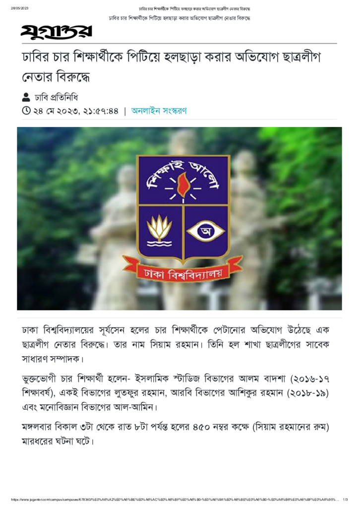 ঢাবির চার শিক্ষার্থীকে পিটিয়ে হলছাড়া করার অভিযোগ ছাত্রলীগ নেতার বিরুদ্ধে