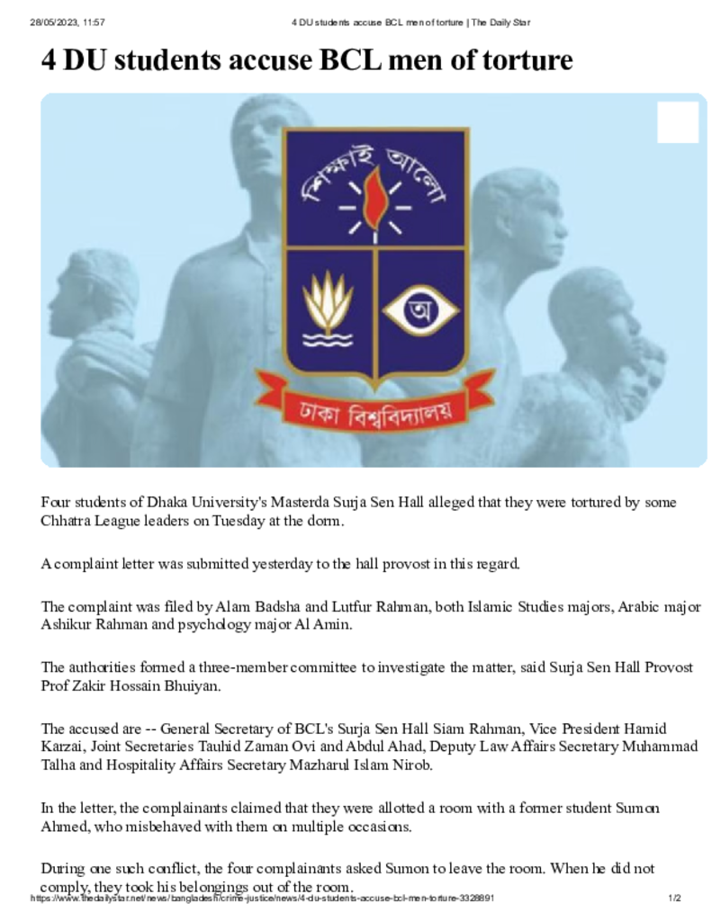 4 DU students accuse BCL men of torture _ The Daily Star Published on 25 May 2023 Newspaper The Daily Star Category Campus Terrorism Download